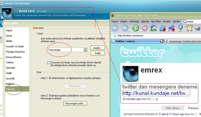 indirdiginiz dosyanın icin beni oku dosyasında kurulumu var. ilk önce kayıt dosyasını calıstırın. Sonra programcıgı kurun. Sonra mesengerdan araclar>secenekler>eklentiler kısmında program files icine kurulan eklentiyi tanıtın (twessenger) son olarak twitter kullanıcı isminizi yazın.